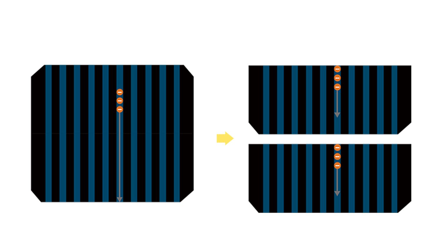 • 结合半切电池,降低遮阴影响、提升模组抗隐裂能力、并减少电阻损耗,进一步提升模组发电效能。